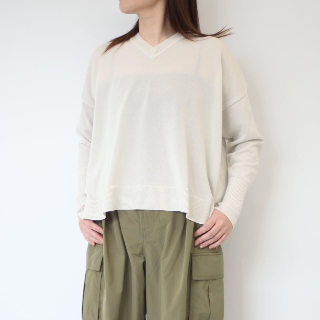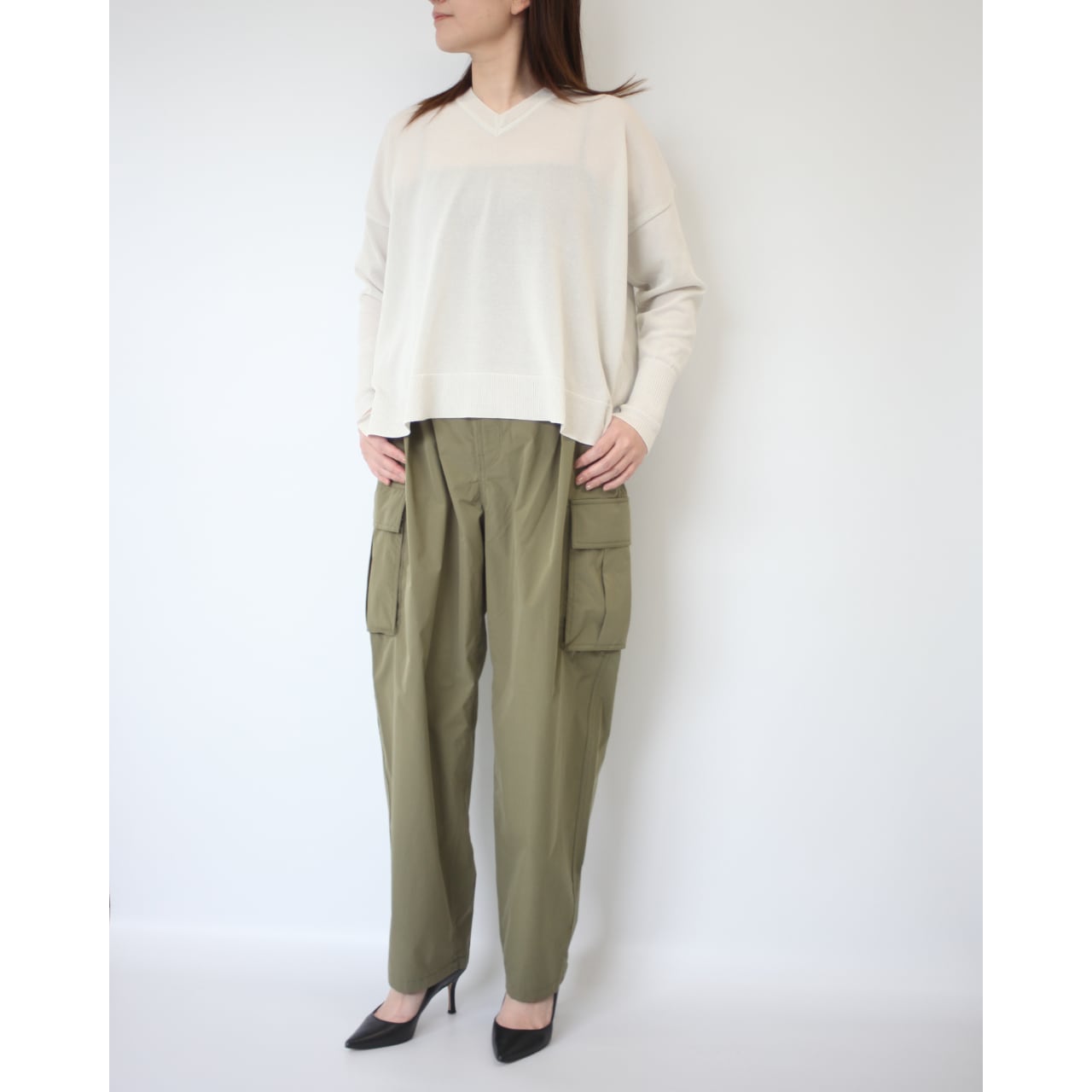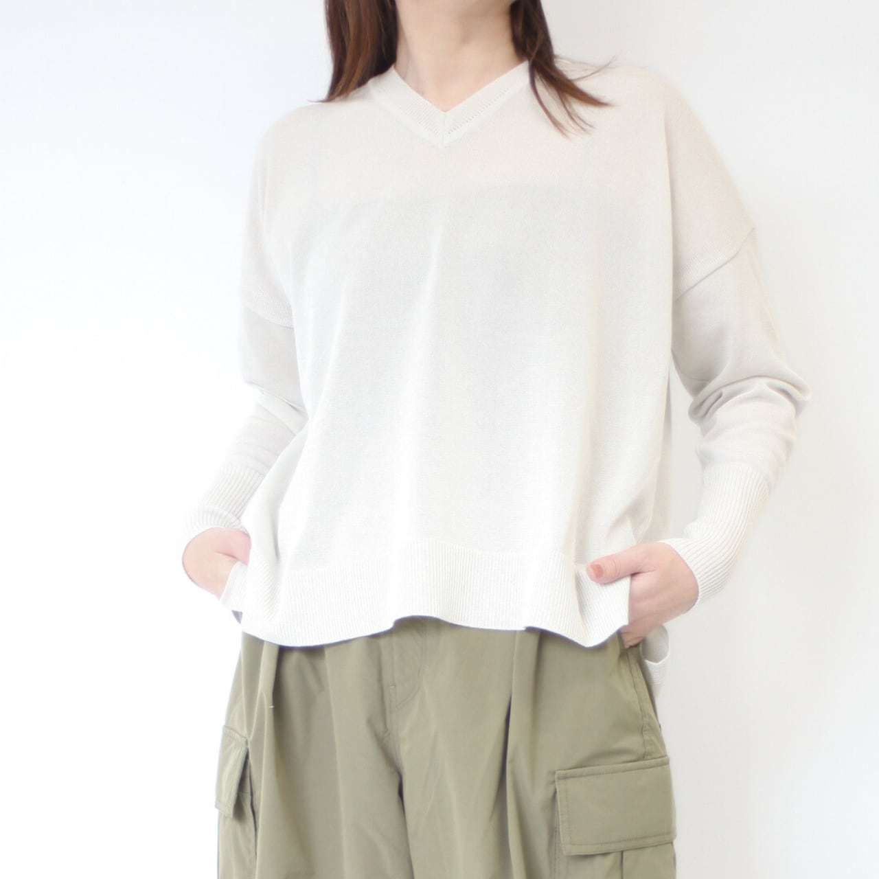 ゆとりのあるワイドシルエットで体のラインを拾いにくく、Vネックで顔まわりはすっきり。