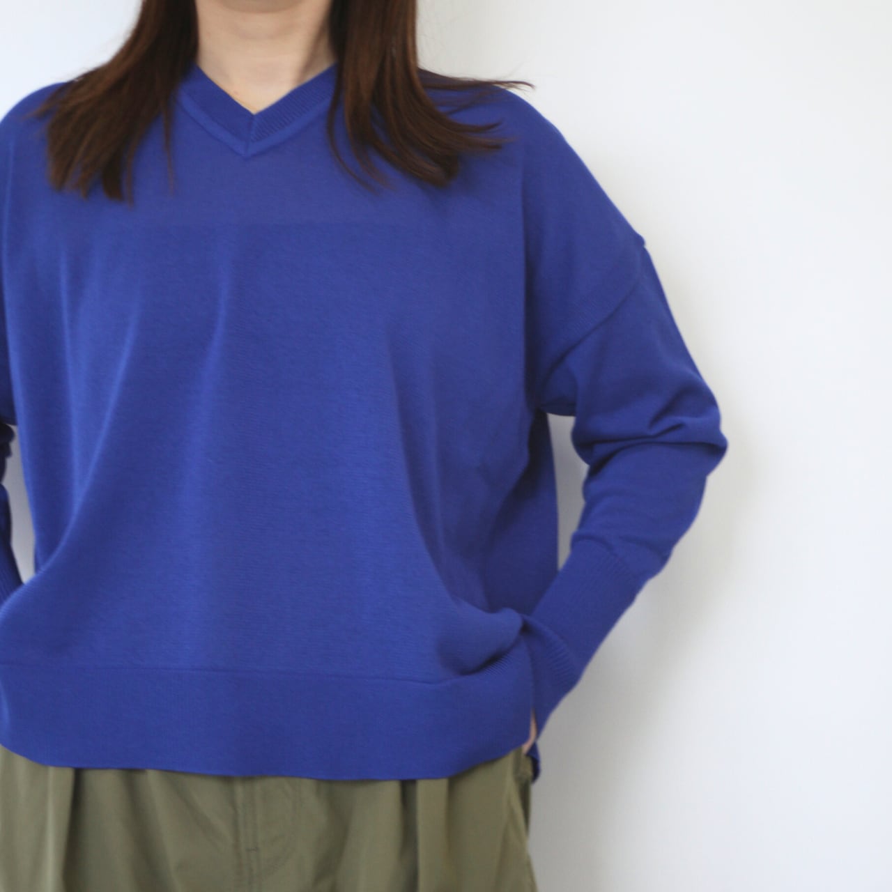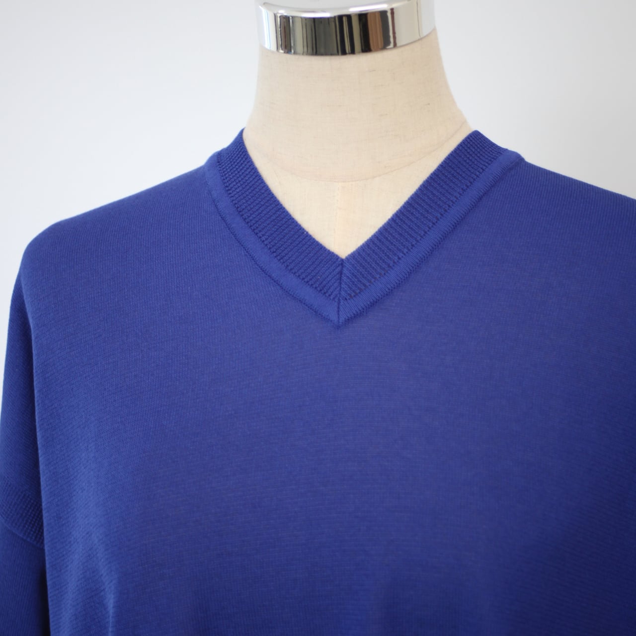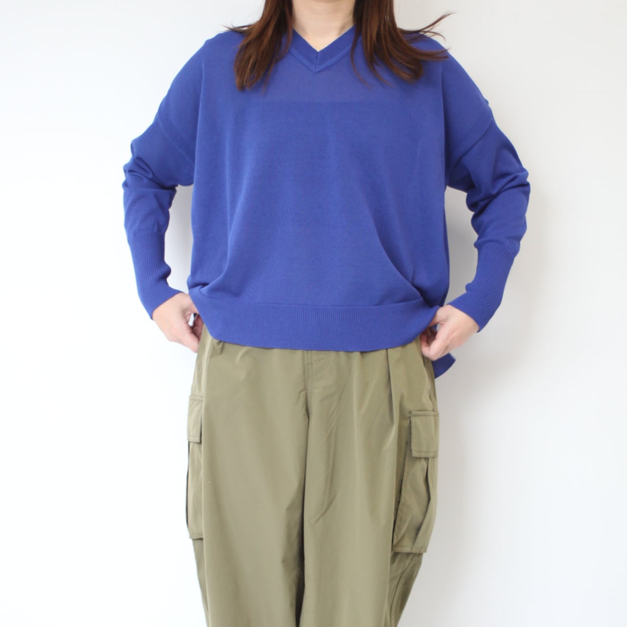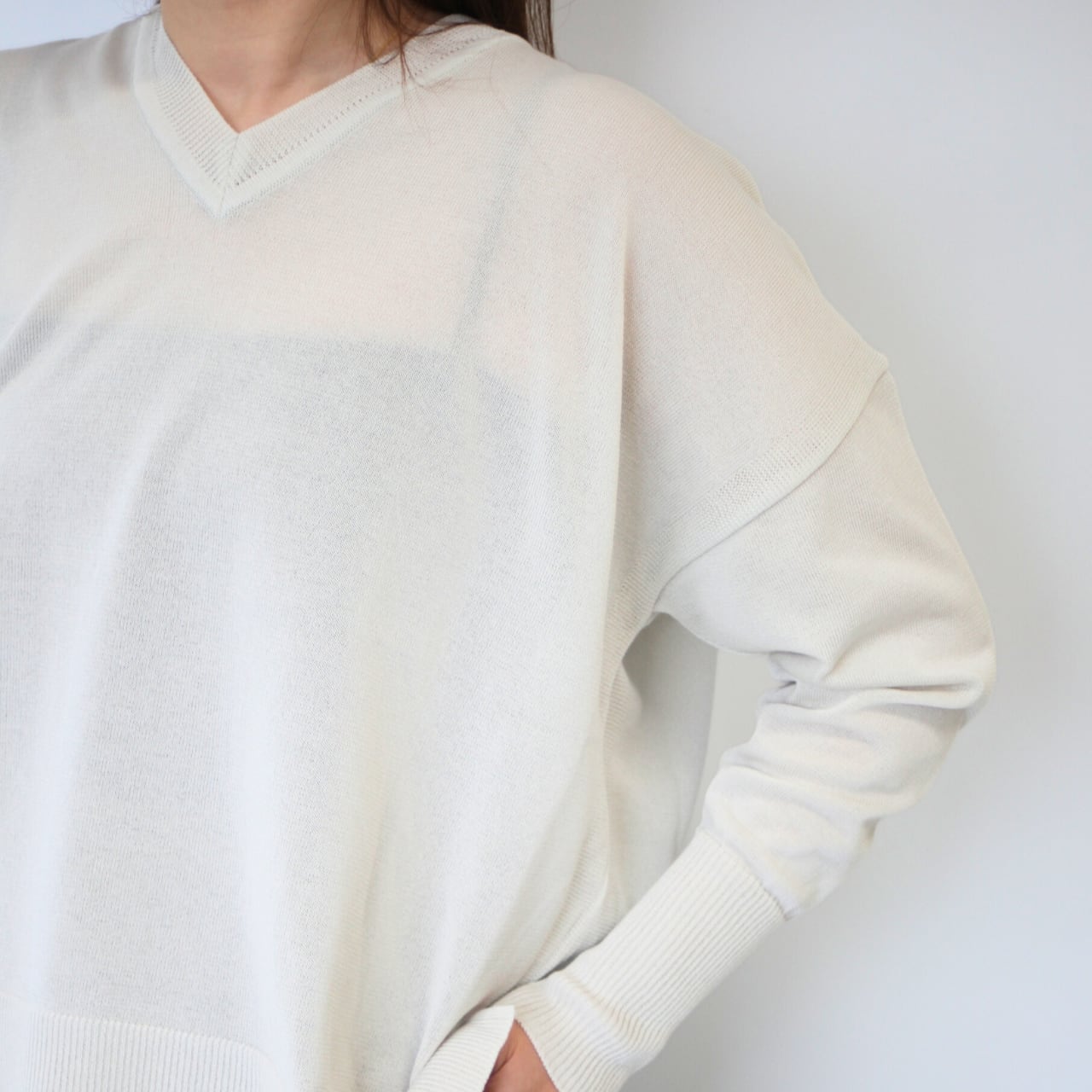 ゆとりのあるワイドシルエットで体のラインを拾いにくく、Vネックで顔まわりはすっきり。