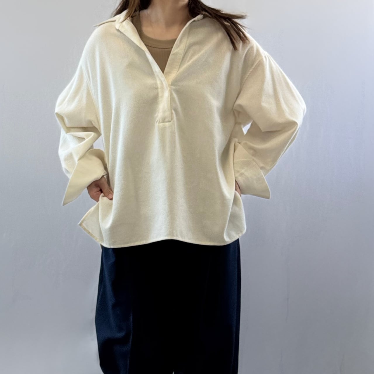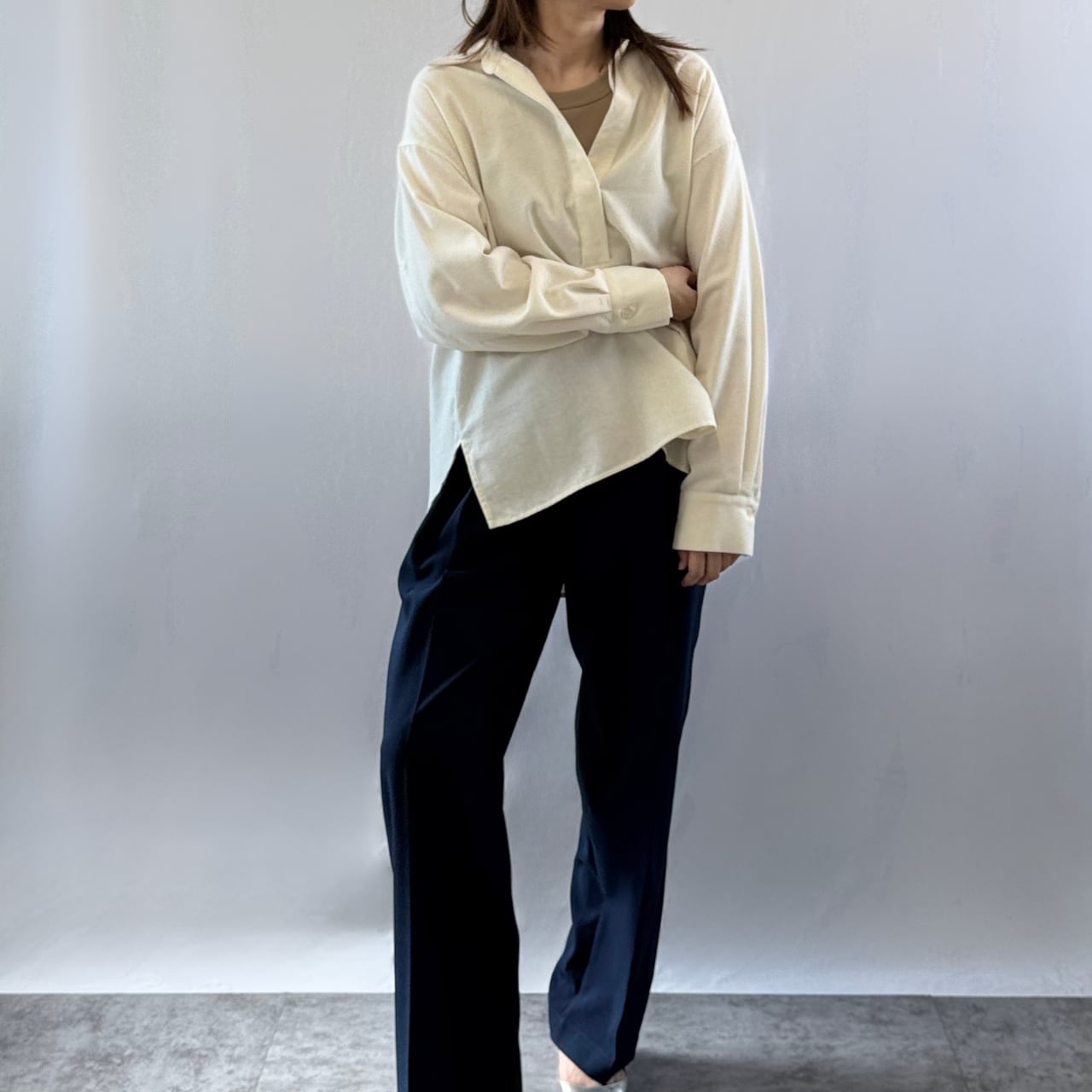 スキッパーカラーが首まわりをすっきり見せ、リラックス感のあるシルエットはデイリーに活躍。